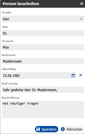 Tipp: Sie können die Details einer Person anschließend abhängig von Ihren Rechten bearbeiten oder löschen sowie ein Bild hochladen.