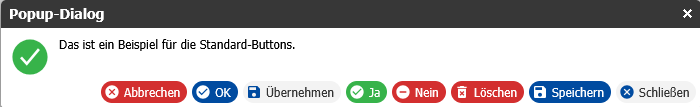 | modal | Legt fest, ob das Popup sich modal verhält. Ein modales Fenster (modal:true) verhindert, dass der Benutzer andere Fenster oder Bereiche der Anwendung bedient, solange das Popup sichtbar ist. | ||||||||||||||||||