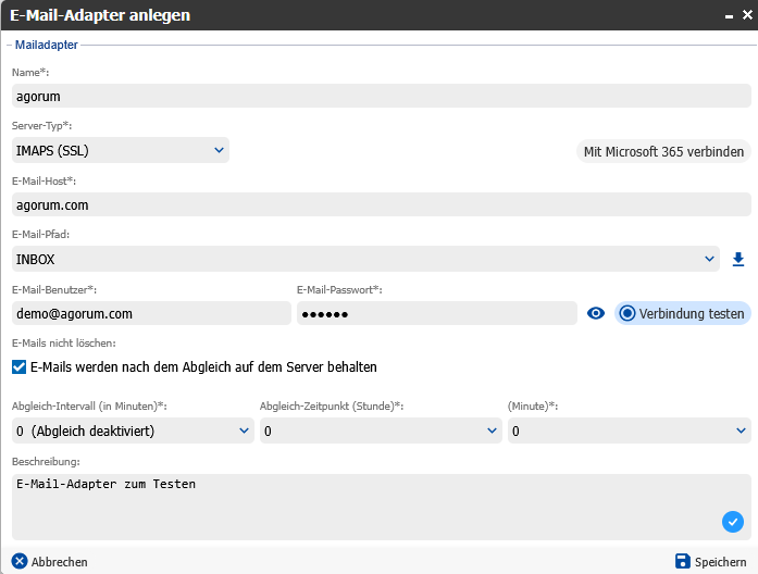 | Abgleich-Intervall (in Minuten) | Definiert in Minuten, wie oft das System E-Mails abruft (0 = keine automatische Synchronisation). |