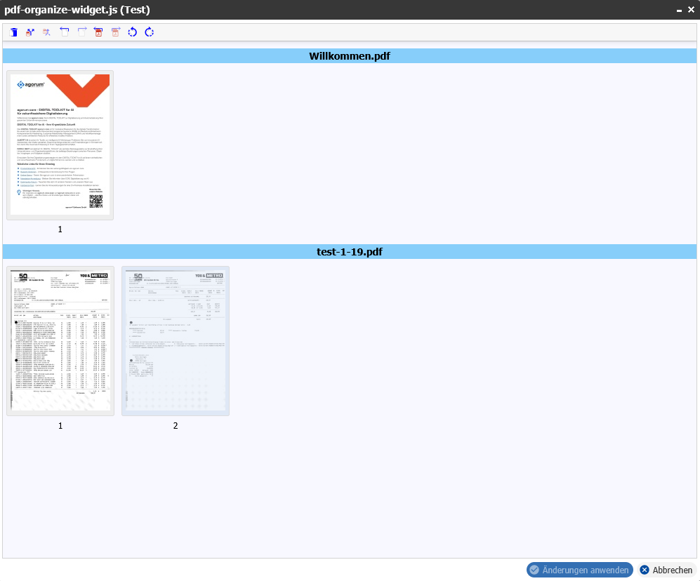 Das Widget agorum.workflow.library.object.pdfOrganize bietet eine interaktive Bedienoberfläche zum Organisieren, Teilen und Zusammenführen von PDF-Dokumenten. Mit diesem Widget können Sie PDF-Seiten neu anordnen, entfernen, zwischen Dokumenten verschieben, Dokumente aufteilen oder zusammenführen und Seiten rotieren.