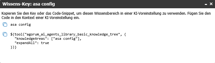 Zu jedem Wissensbereich (und optional zu einer Unterkategorie) können Sie einen Wissens-Key kopieren. Der Key entspricht dem Pfad im Wissensbaum (z. B. asa_config oder agorum-core-development/javascript-api). Alternativ können Sie ein fertiges Code-Snippet kopieren, das Sie in den Kontext einer KI-Voreinstellung eintragen.