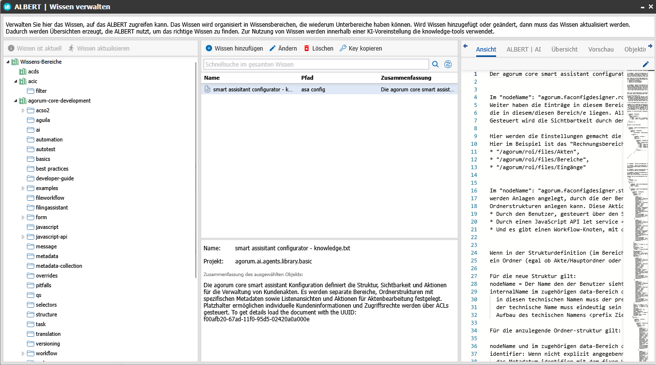 Mit ALBERT | AI Agents erhalten Sie ein Basiswissen mit vielen Informationen, die für agorum core relevant sind. Eine Übersicht über das mitgelieferte Wissen finden Sie hier: Ausgeliefertes KI-Wissen