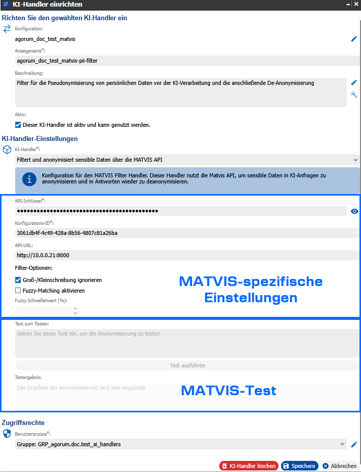 | KI-Handler | Wählen Sie in der Auswahlliste den KI-Handler Filtert und anonymisiert sensible Daten über die MATVIS API aus. |