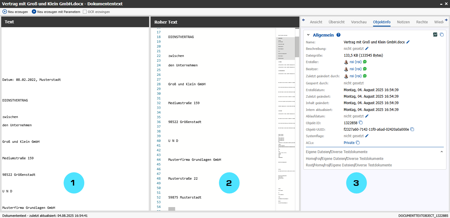 Sie können den Dokumententext über die Aktionen in der Bedienleiste des Dokumententextfensters neu erzeugen lassen. Nach der Erstellung des Dokumententexts wird das Objekt neu indiziert.