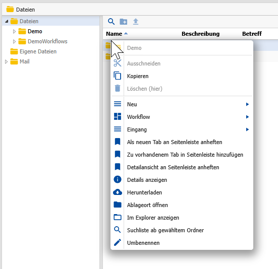 Das Kontextmenü erscheint, sobald Sie mit der rechten Maustaste einen Ordner oder ein Dokument anklicken, und bietet verschiedene Aktionen.