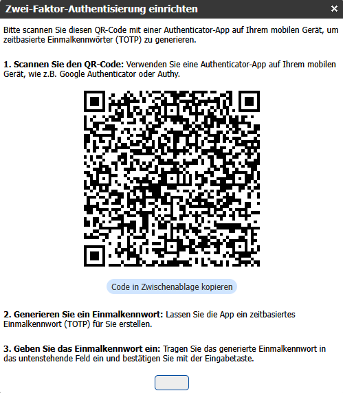 Tipp: Falls Sie den QR-Code nicht scannen können, kopieren Sie den Code mithilfe der Schaltfläche Code in Zwischenablage kopieren und fügen den Code über die Kopie in die TOTP-APP ein. Das kann etwa erforderlich sein, wenn Sie agorum core und die TOTP-App auf demselben Gerät verwenden.