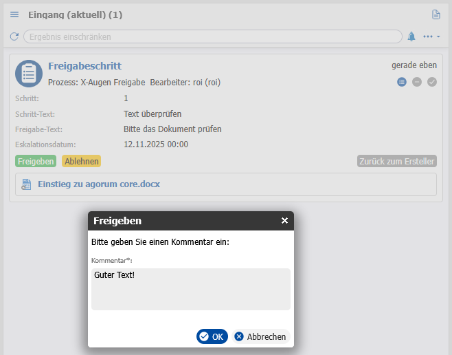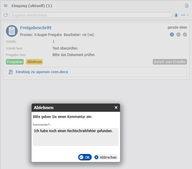 Der Bearbeiter kann einen Text eingeben, warum er den Freigabeschritt ablehnt.