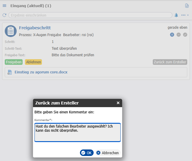 Der Bearbeiter muss einen Text eingeben, warum er den Freigabeschritt zurück zum Ersteller gibt.