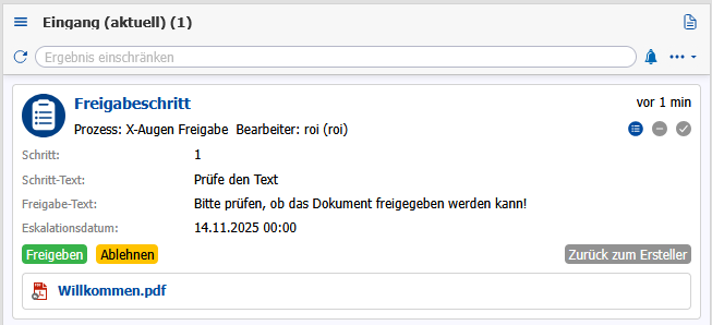 Im Eingang kann die Freigabe/Ablehnung auch direkt über die entsprechenden Buttons erfolgen. Auf diesem Weg könnte die Freigabe sogar über ein Smartphone oder ein anderes mobiles Gerät durchgeführt werden.