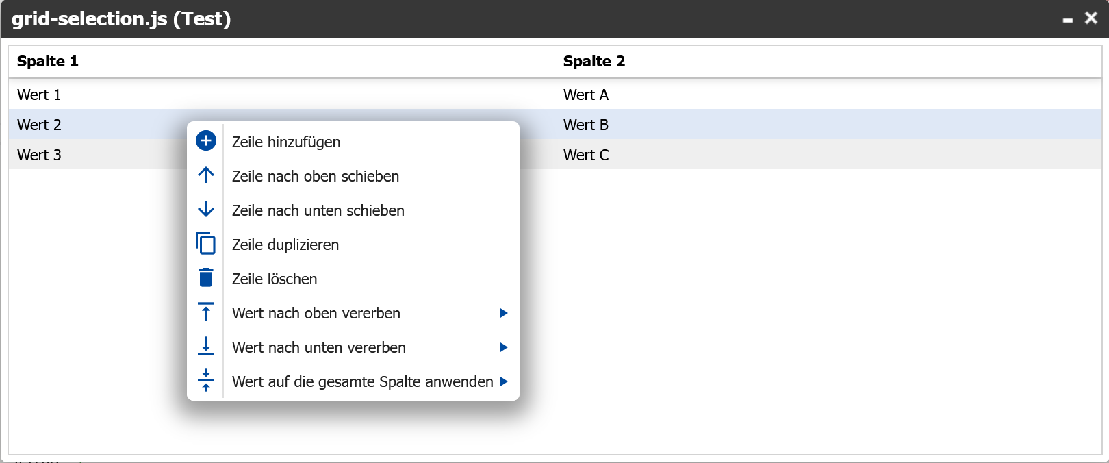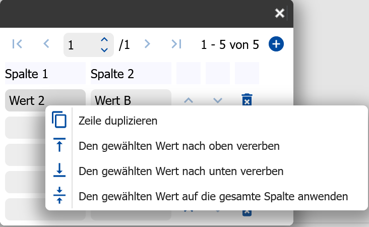 | setColumnValues | Aktiviert das Vererben von Werten einer Spalte nach oben, unten oder in beide Richtungen. Das System übernimmt nur die Werte, nicht die Zustände wie disabled, readOnly, hidden.