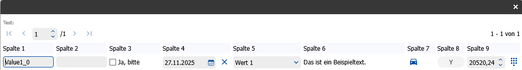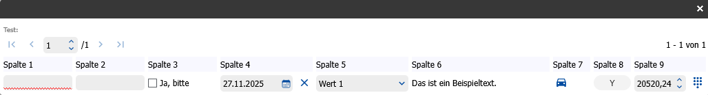 Hinweis: Das Element agorum.composite.form.element.splitGrid basiert auf grid und erweitert es um Split-Funktionalität. Alle Parameter, Events und Funktionen von grid stehen auch in splitGrid zur Verfügung.