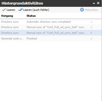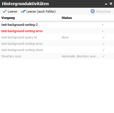 Hintergrundaktivitäten sind laufende oder abgeschlossene Prozesse in agorum core. Solche Hintergrundaktivitäten laufen etwa, wenn ein Benutzer einen ZIP-Anhang entpackt. Sie können die Hintergrundaktivitäten verfolgen und feststellen, welchen Fehler das System meldet.