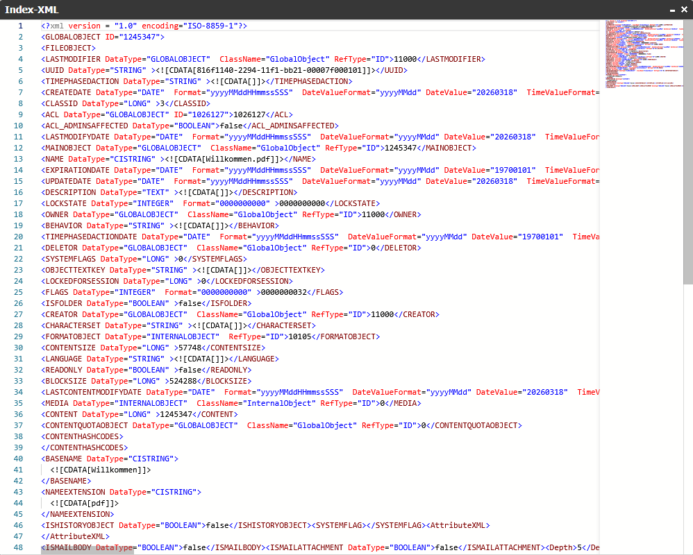 Das System erstellt eine temporäre Datei im Home-Ordner des angemeldeten Benutzers, die nach 24 Stunden automatisch gelöscht wird. Diese Datei enthält die vollständige XML-Struktur mit allen im Suchindex gespeicherten Feldern des Objekts. Die erzeugte Datei wird automatisch im Editor geöffnet.