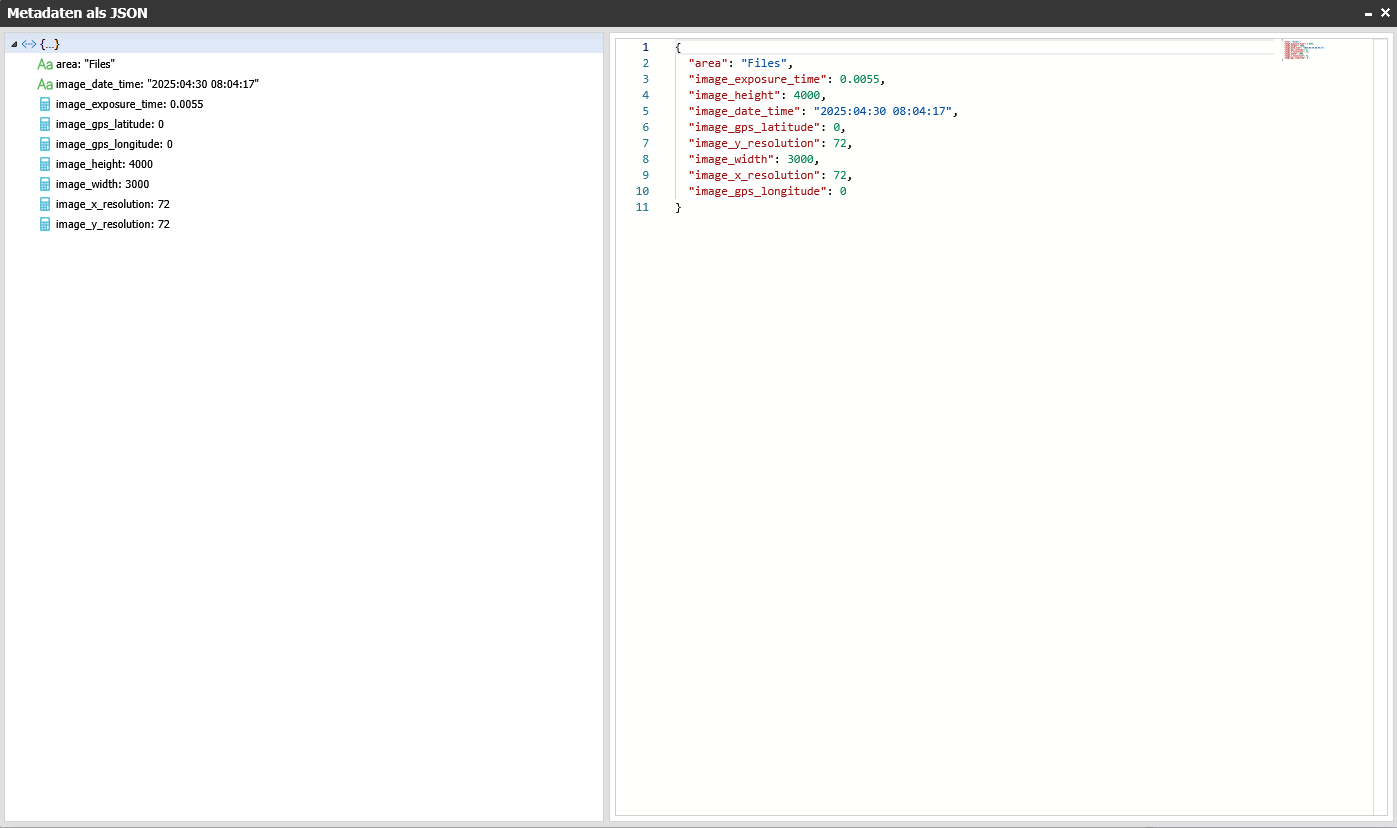 Mit dieser Aktion lesen Sie die Metadaten eines Objektes aus und stellen sie als JSON-Struktur dar. Im Gegensatz zu Index-JSON, das die im Suchindex (Solr) gespeicherten Felder anzeigt, zeigt diese Aktion die direkt am Objekt gespeicherten Metadaten an.
