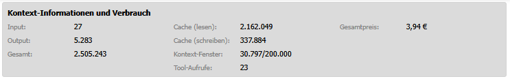 | Cache (schreiben) | Cache-Write-Tokens. Anzahl der Tokens, die erstmalig in den Cache des Anbieters geschrieben werden. |