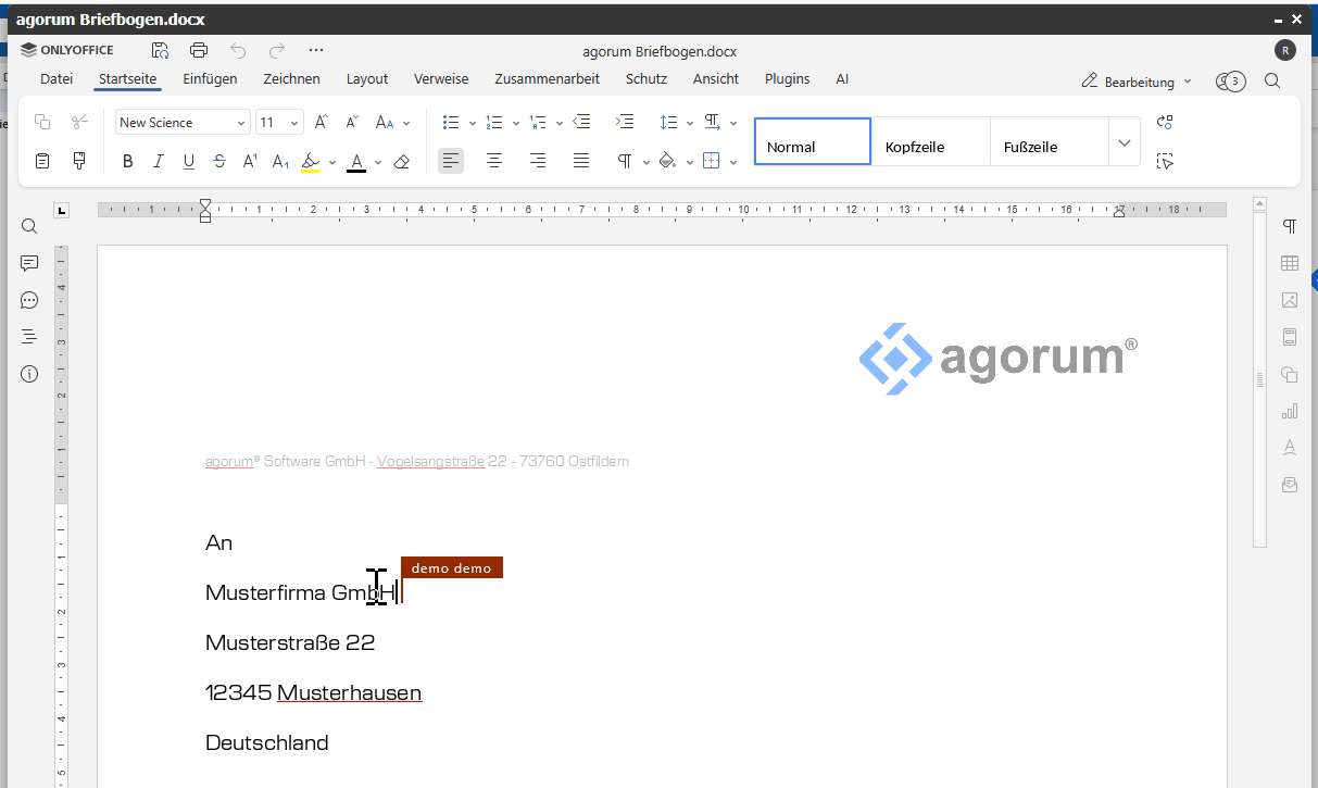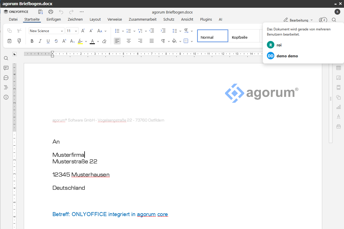 Mit dem Plugin Integration | ONLYOFFICE bearbeiten Sie verschiedene Office-Formate direkt im Browser in agorum core. Bearbeiten Sie ein Dokument, sehen Sie im Dokument in Echtzeit, welche Stelle von Ihren Kollegen gerade bearbeitet wird.