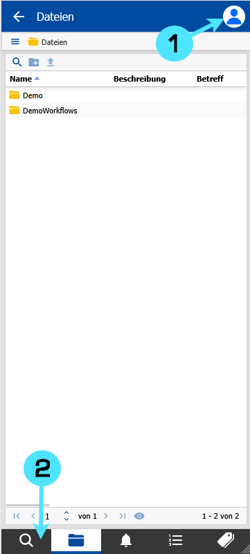 Sie finden die Tab-Leiste, die Ihnen Zugriff auf die verfügbaren agorum core Aktionen/Anwendungen bietet, unten in der Anzeige. Die Tab-Leiste entspricht der Seitenleiste in der Desktop-Ansicht.