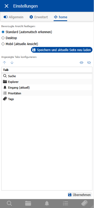 In den home-Einstellungen können Sie zum einen festlegen, welche Ansicht (Desktop, Mobil) Sie auf dem von Ihnen verwendeten Gerät verwenden wollen. In der Regel wird die Ansicht aber automatisch erkannt und Sie müssen diese Einstellung nicht ändern. Zum anderen können Sie die Reihenfolge der Apps in der Tab-Leiste bei Bedarf ändern oder Apps ein- oder ausblenden.