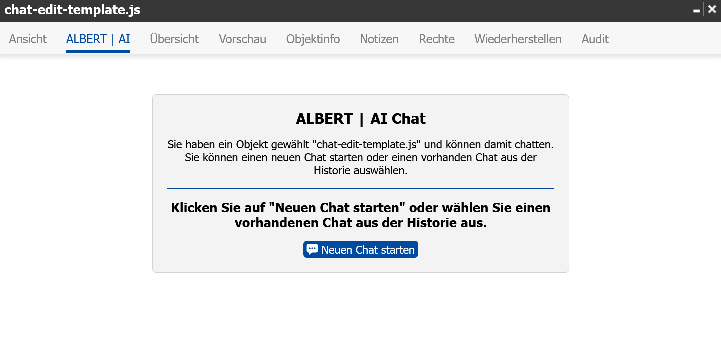 Wenn Sie bereits einen Chat zu einem bestimmten Ordner oder einer Datei geführt haben, wird dieser Chat automatisch wiederhergestellt, sobald Sie das entsprechende Objekt erneut auswählen und den Reiter ALBERT | AI öffnen.