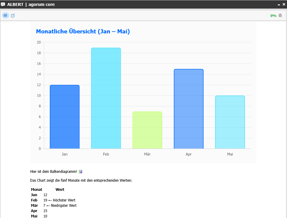 Sie können durch das Einbinden von Chart.js auf diese Weise etwa interaktive Diagramme im Chat wie das folgende erstellen: