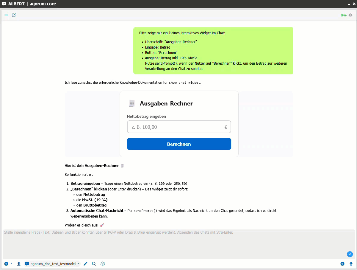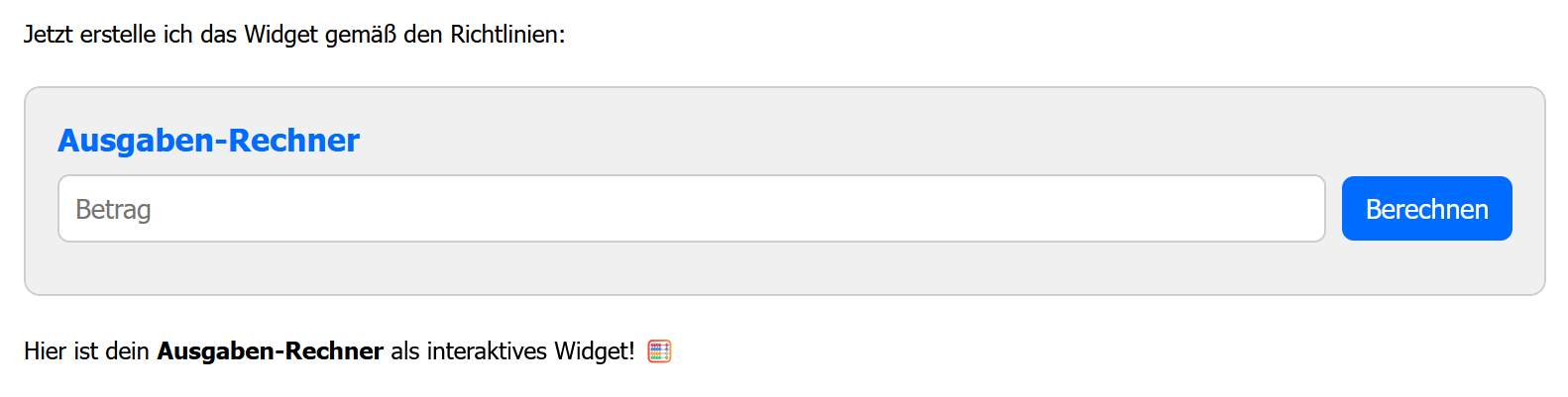 Bitte zeige mir ein kleines interaktives Widget im Chat: - Überschrift: "Ausgaben-Rechner" - Eingabe: Betrag - Button: "Berechnen" - Ausgabe: Betrag inkl. 19% MwSt. Nutze sendPrompt(), wenn der Nutzer auf "Berechnen" klickt, um den Betrag zur weiteren Verarbeitung an den Chat zu senden.