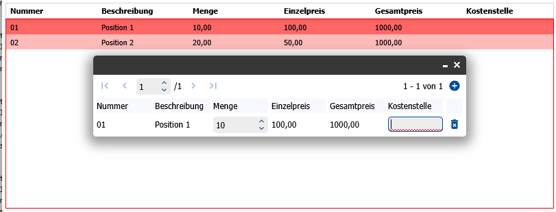 Dieses Element stellt Positionen (Zeilen) in Listenform dar und erlaubt das Aufsplitten der Postionen, etwa für die Zuweisung von verschiedenen Kostenstelle bei der Kontierung.