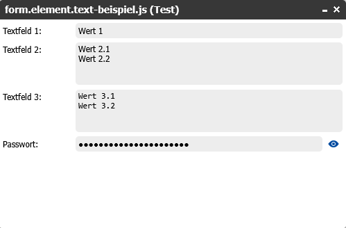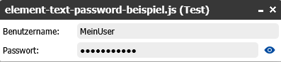 Durch das Setzen der Option password: true wird das Passwortfeld als Eingabefeld mit verdeckter Zeichenanzeige dargestellt. Mit revealButton: true erscheint zusätzlich ein Symbol (Auge), mit dem Benutzer das Passwort vorübergehend im Klartext anzeigen lassen können.